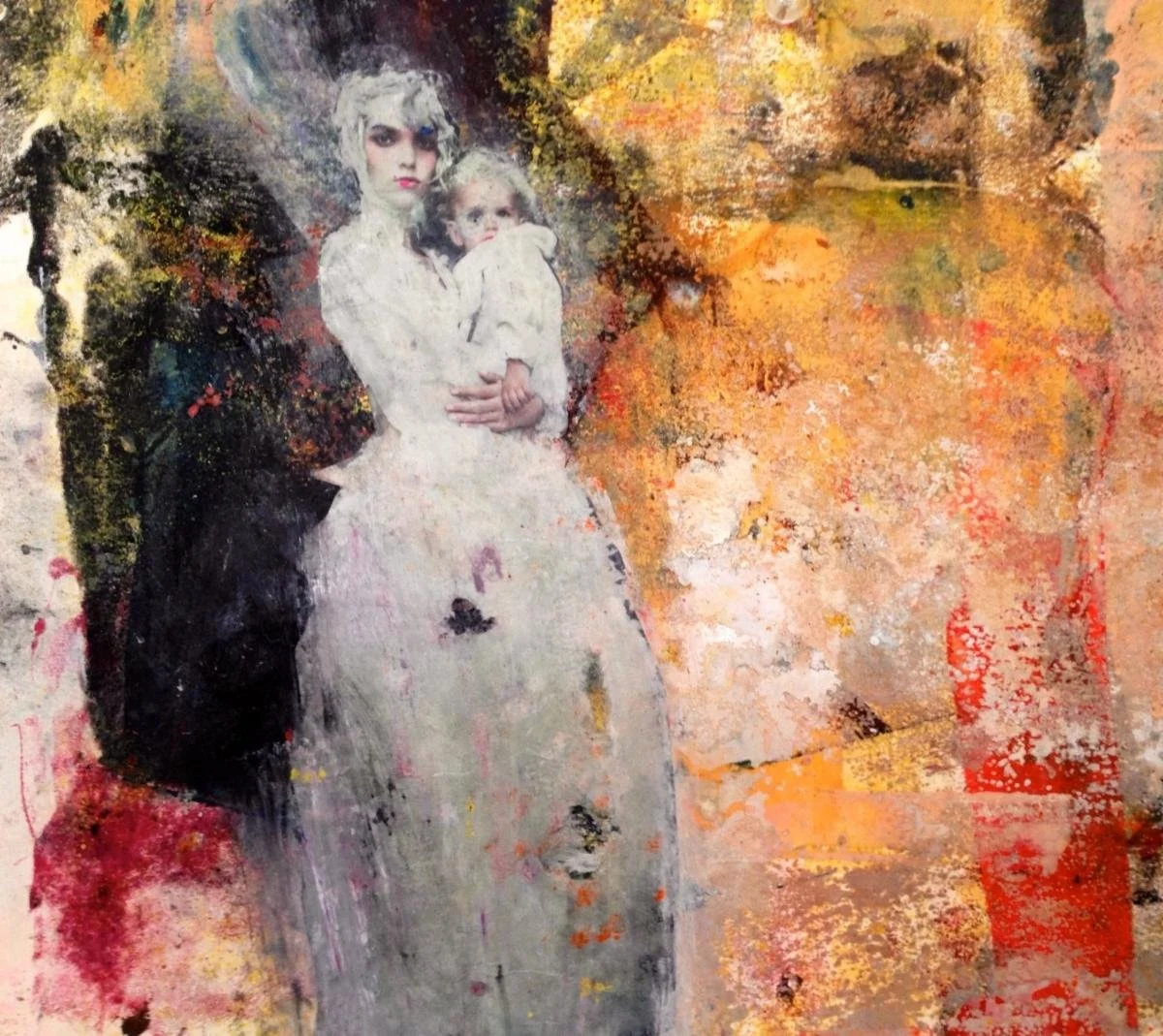 “Madonna and Child” (mixed media collage on paper, oil, ink, beeswax), by Lexington, Mass.-based artist Sirarpi Walzer, in the joint show “Efflorescence,’’ with Patricia Ganek, at Three Stones Gallery, Concord, Mass., through Aug. 27.