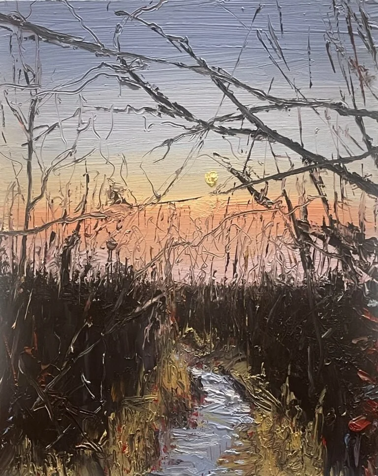 “Christmas Snow’’ (oil on panel), by Marieluise Hutchinson, in the “Holiday Small Works 2018” show at the Copley Society of Art, Boston.