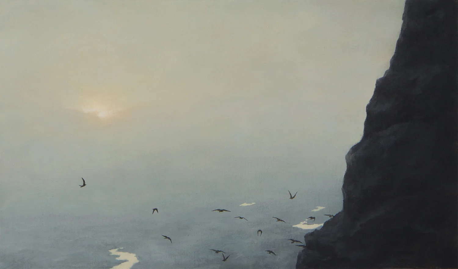 "Flock, haze'' (acrylic on linen), by Dozier Bell, in a group show at Corey Daniels Gallery, Wells, Maine, Aug. 10-Sept. 9. The gallery says his "landscapes are created from memory, reliant upon an intrinsic awareness of patterns of light and dark, movement and color. Conjuring the unknowable forces that shape our lives and environment, Bell's work offers a masterful immersion within sky, land, water, bird and air.''