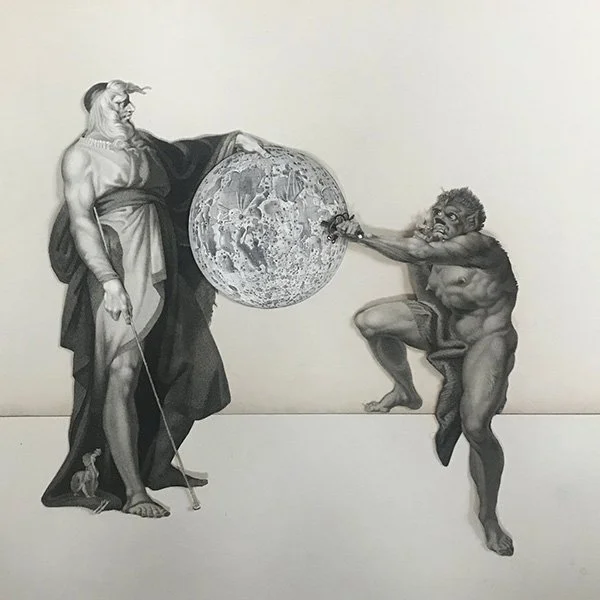"Modern Religion (They Know Not What They Do)"(cut paper collage using 18th Century copper plate engraving, 19th Century bookplates, and found paperboard), by Sarah Seaver, in the group show "Brotherhood of Thieves,'' at the Corner Gallery, Jaffrey N.H., Oct. 4-Nov. 16.