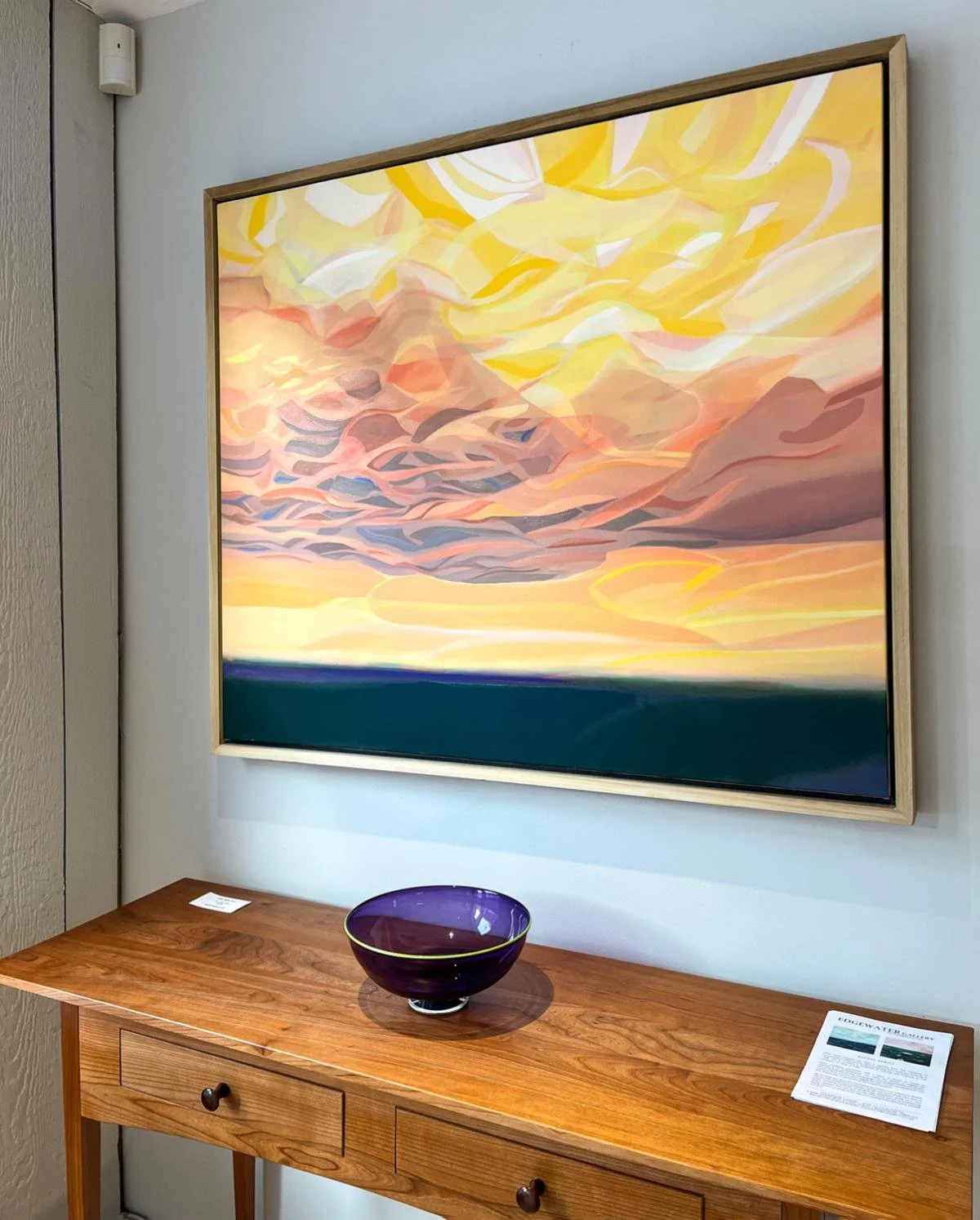 “The viewer recognizes these as landscapes. Serio gives us a horizon line as a foothold for this but beyond this reference the compositions are investigations of color and shape, rhythmically layered to represent perceptions of light, land, and memories.’’