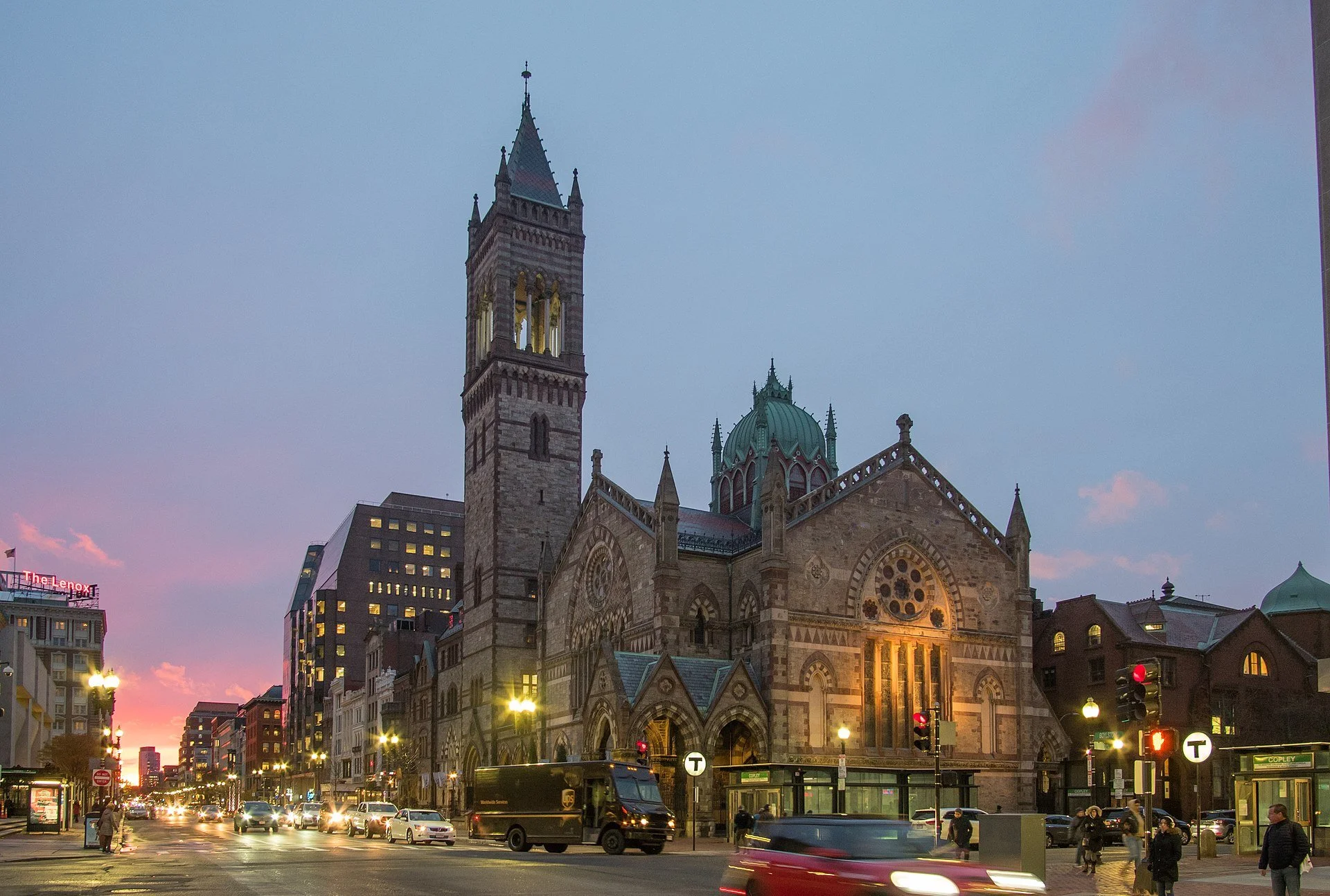 Old South Church at Copley Square at sunset. This United Church of Christ congregation was first organized in 1669.