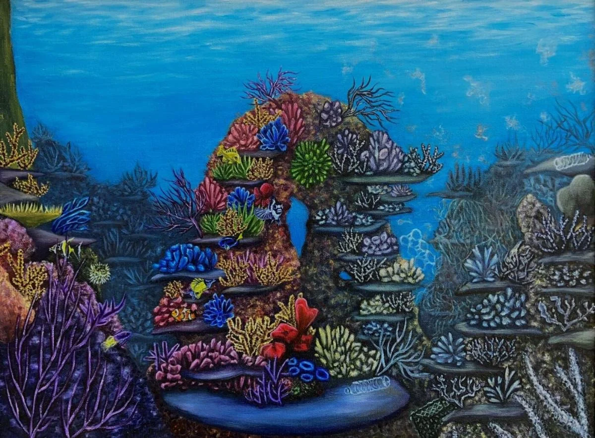 “Bleached” {by ocean acidification?} (oil on canvas), by Weymouth, Mass.-based Elysia Johnson, in the New England Collective XII show at Galatea Fine Art, Boston, Aug. 5-28.