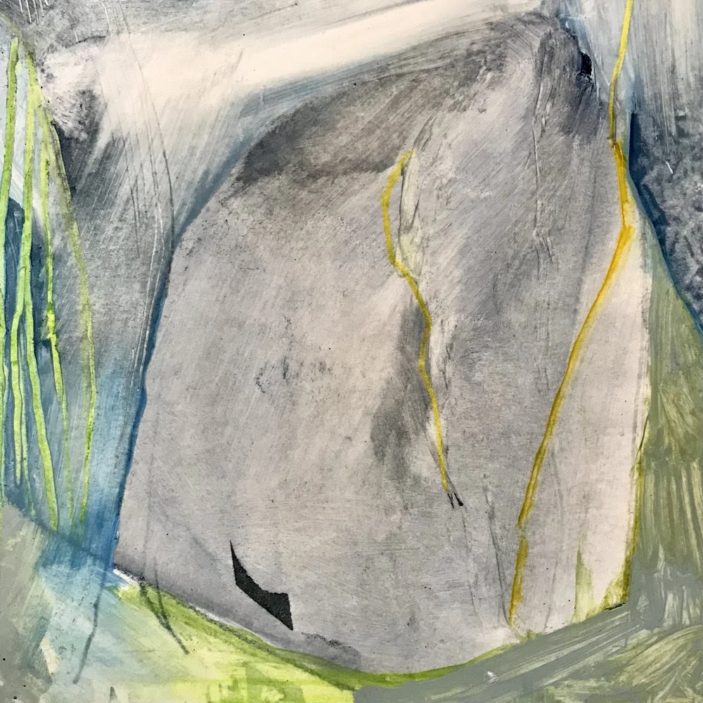“I love hiking, particularly in wild, desolate places, and am fascinated by looking at the way light falls on the landscape when I am out on the trail, creating shapes that are craggy, or geometrical, or diffused—or shifting from one to the other. Sometimes I look at the sky or a mountain pass and try to remember the individual parts of the scene for later, when I will imagine the parts rearranged, the lights and darks reversed, or perhaps just one form that caught my eye. My dream travels take me to treks in Tibet, Alaska, Wyoming—I look at pictures of the landscapes in the places I’d like to go, and those images work their way into what I’m making as well. I am in awe of nature and the colors that exist and arise organically and atmospherically. Although I’m not painting the landscape representationally, my observations and memory of it is ever-present in my work, in some form.’’