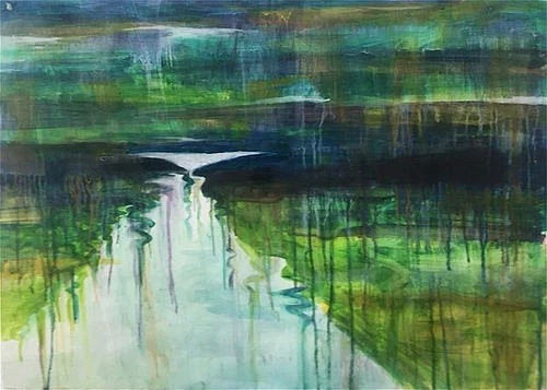 She says: “Using nature as the springboard, I love to use the abstract nature of ‘water reflections’ as a design element and subject matter. The paintings are from a series I have been working on for the past 4-5 years. I live on a river in Lowell and have a view of water from my home….