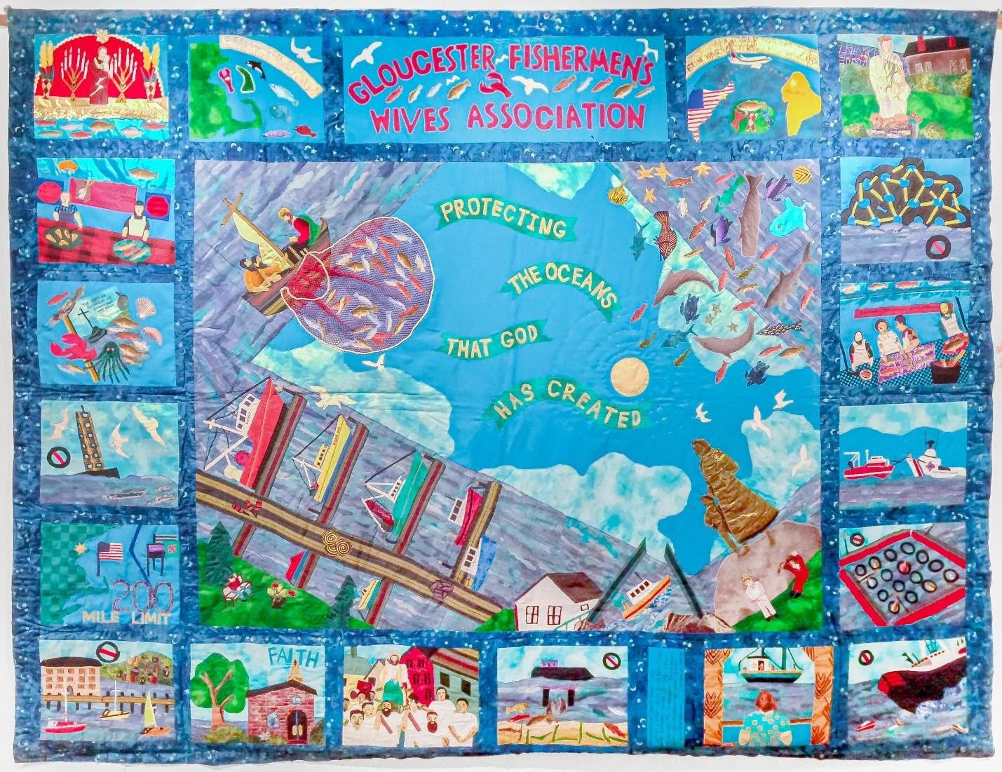“Protecting the Oceans that God Has Created’’ is a narrative quilt made by members of the Gloucester Fishermen’s Wives Association in collaboration with Clara Wainwright in 1998. It can be seen at the Cape Ann Museum, Gloucester, through Sept. 26. It’s on loan from the Gloucester Fishermen’s Wives Association.