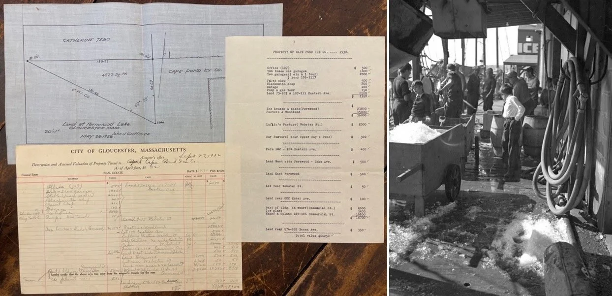 At the Cape Ann Museum, Gloucester, Mass.: Left, items from the Cape Pond Ice Company Collection, including blueprints and listings of assets. Right, Cape Pond Ice Wharf, circa 1930s.