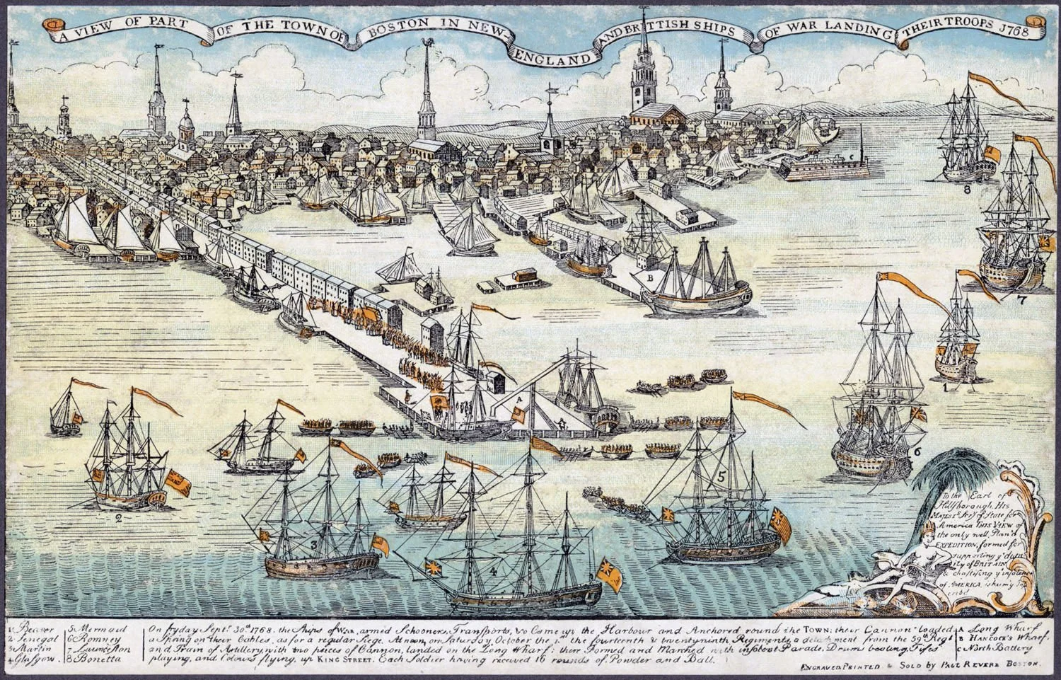 Paul Revere's 1768 engraving of British troops arriving in Boston was reprinted throughout the colonies