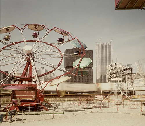 "Pittsburgh, Carnival and Train'' (derail of a vintage chromogenic print), by Joel Meyerowitz in the show "Fragile Paper Timeships,'' at Mount Holyoke College Museum of Art,  South Hadley, Mass., though May 29.