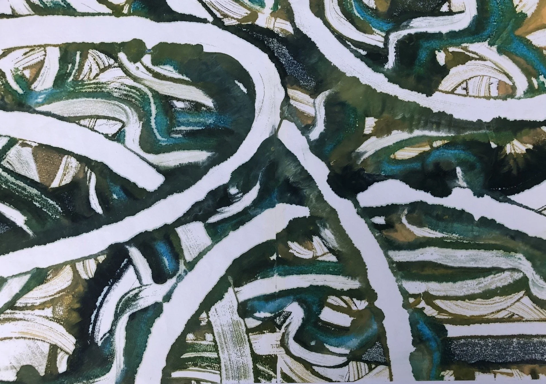 “This series explores my own personal ‘Dreamtime’ where I can be physically at home but mentally, spiritually and emotionally away. I use line as symbol of path, thought, or journey. These lines tend to overlap in many layers, each curve signifying a decision point, change in direction or choice.’’