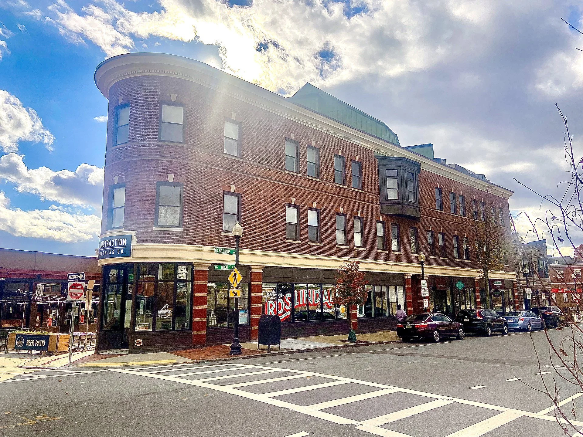 A portion of Roslindale Square on Belgrade Avenue, across the street from the Roslindale Village MBTA commuter rail stop.