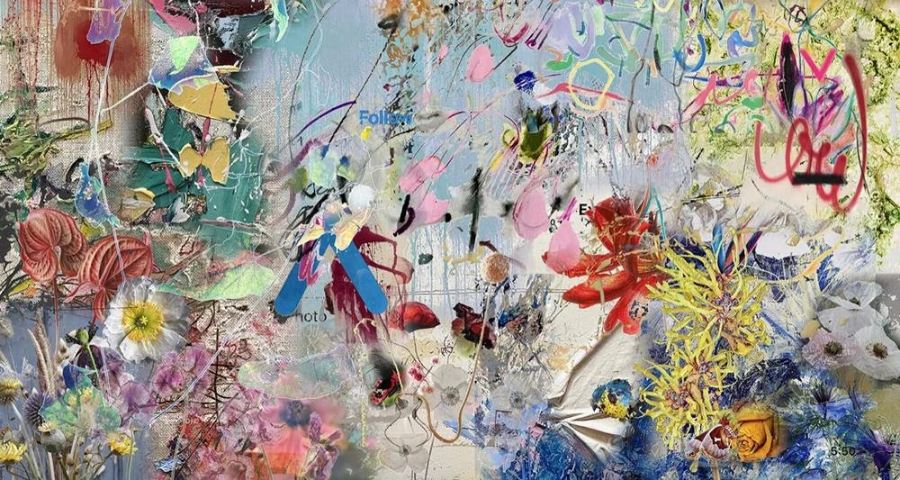 “Canadian artist Emily Filler weaves painting, printmaking and photography together in her ‘painterly collages’. Using old photographs, pieces of fabric, and silk-screened images to create imaginary landscapes and whimsical bouquets of flowers, Filler’s artwork walks the line between the real and imaginary. Flowers act as a departure point to a world that dissolves into abstraction, whereby creating a sense of the familiar, but also the feeling that one is falling into a dream. What began as fragments are finalized into a complete image, something whole.’’