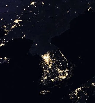 The Korean Peninsula at night. Note the brightness of Seoul, the South Korean capital, and the darkness of North Korea.