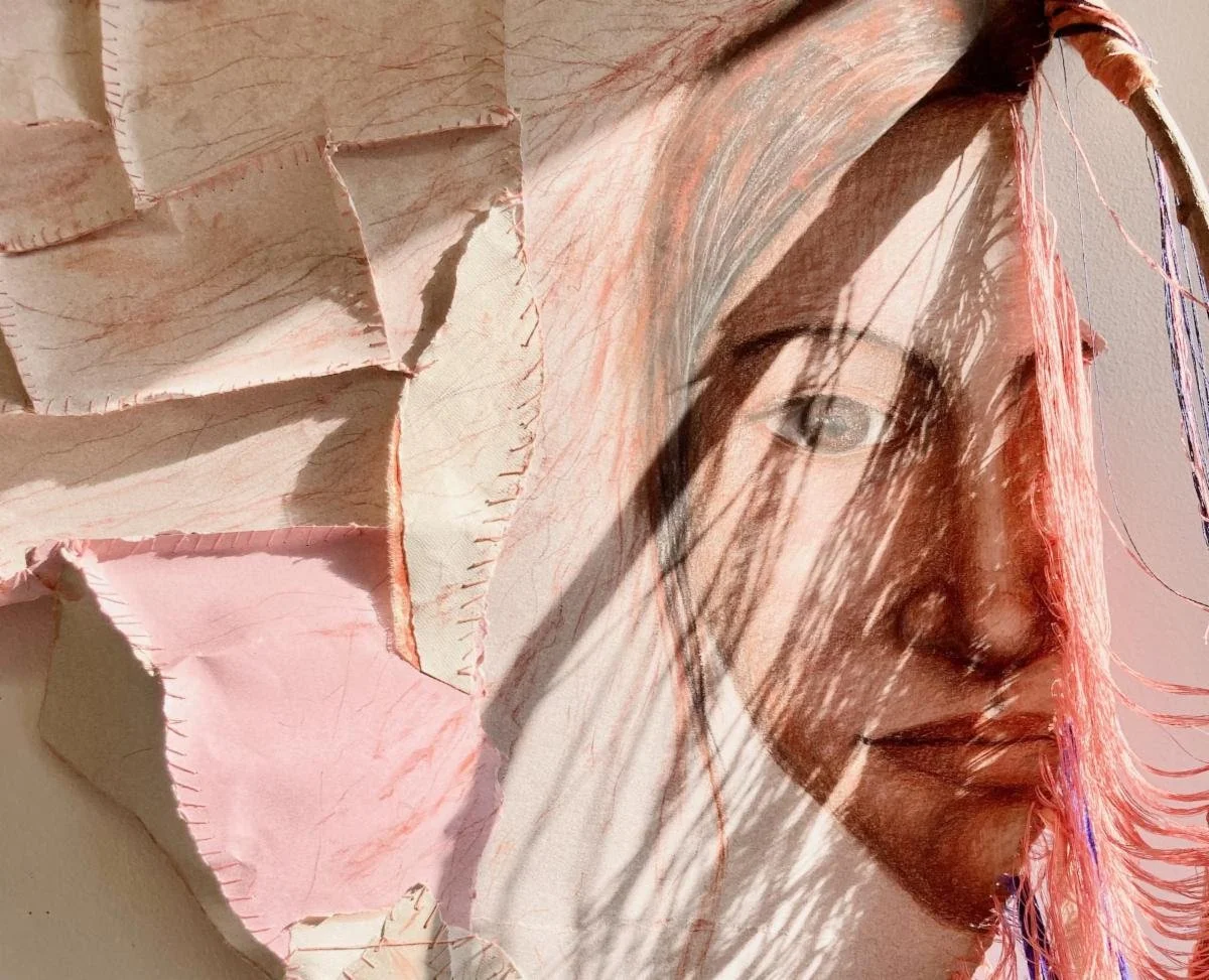 “This work is a contemplation on personal loss and global change. Seeing those close to me suffer through illness and pain is excruciating; global suffering echoes this personal grief. While I find beauty in the act of drawing, I find solace in deconstructing and rebuilding. Threads make connections between the drawn elements and beyond – connecting the physical and ethereal. Cloth reimagines the drawings by mending the forms and extending the images.’’