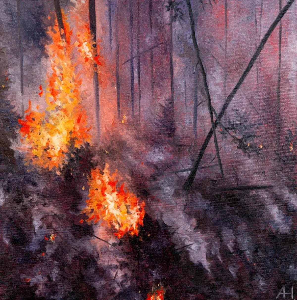 “Fires of Blaine County” (oil on canvas), by Amelia Hawkins, in the show “Senior Thesis 2024,’’ at the Bates College Museum of Art, Lewiston, Maine.