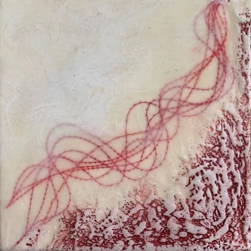 “Onward” (paper, thread, encaustic paint, oil stick on braced panel), by Portland, Maine-based artist Kimberly Curry.