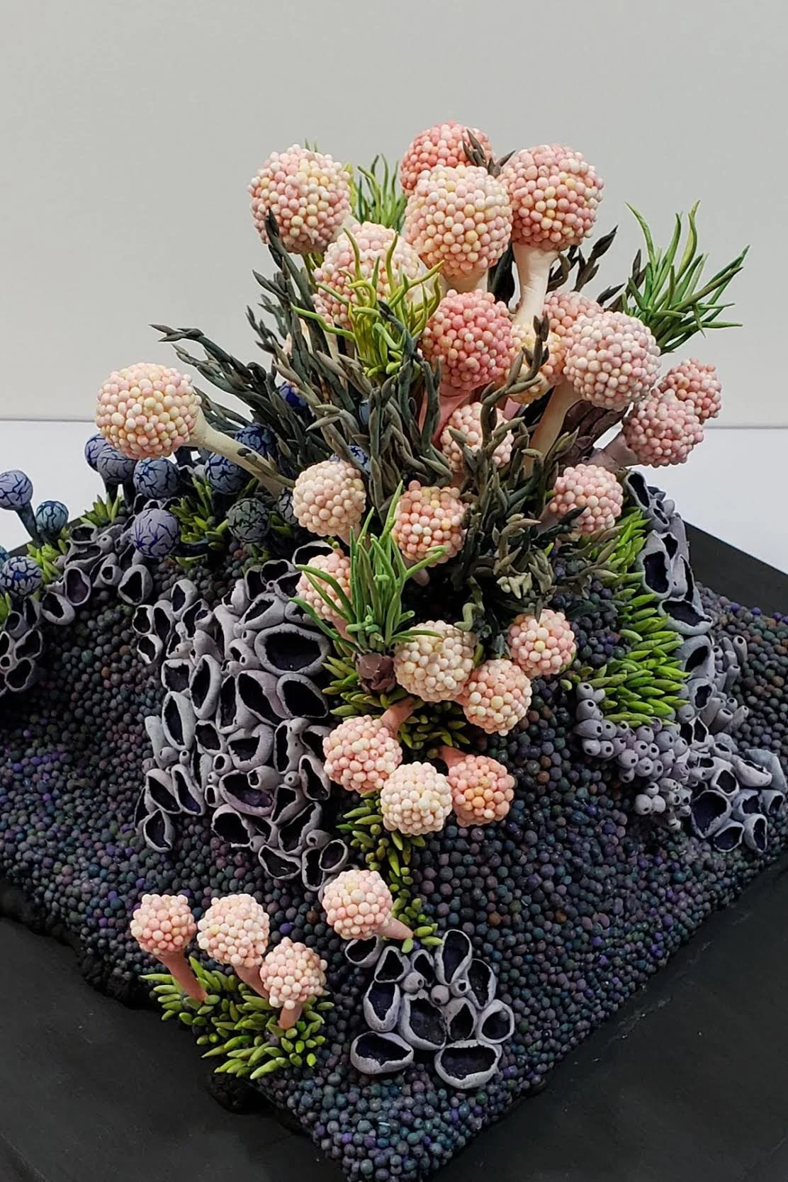 “Inspired by fungal formations,’’ the show “features delicately detailed sculptural works constructed from hand-made cold porcelain and recycled materials. The artist muses, ‘As I traversed old wooden bridges, walked down roads lined with trees, and passed by my neighbors' houses, {in her hometown of Newton, Mass.} I noticed something ubiquitous: lichens, fungi, slime mold, and moss.’ She began to observe these small yet fascinating organisms closely, adjusting the zoom on her phone camera to capture their minute details. The microworld proved to be a wellspring of inspiration for her work.’’
