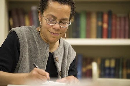 Lauret Savoy signing books at the Providence Athenaeum.