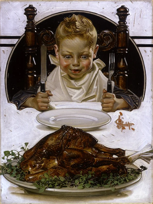 "Ready for Thanksgiving Feast'' (oil on canvas), by J.C. Leyendecker (1874–1951), at the National Museum of American Illustration, Newport, R.I. This kid's family was presumably very happy that World War I had ended on Nov. 11, 1918. But in part because of ill-considered, revenge-seeking peace treaties signed in 1919, there would be another, even worse, world war in 20 years. Perhaps the boy who was the model for the one here would fight in it. Perhaps he'd look back longingly at the family feasts of his childhood as he ate his Army K-rations.