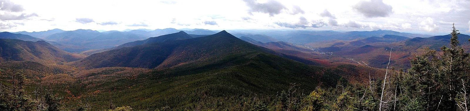 Panorama showing Mt. Liberty, Mt. Flume, parts of the Pemigewasset Wilderness, and parts of Franconia Notch State Park in the White Mountains.