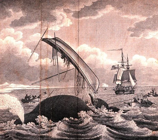 “Nantucket Sleigh Ride”: Illustration of the dangers of the "whale fishery" in 1820. Note the taut ropes on the right, lines leading from the open boats to the harpooned animal.