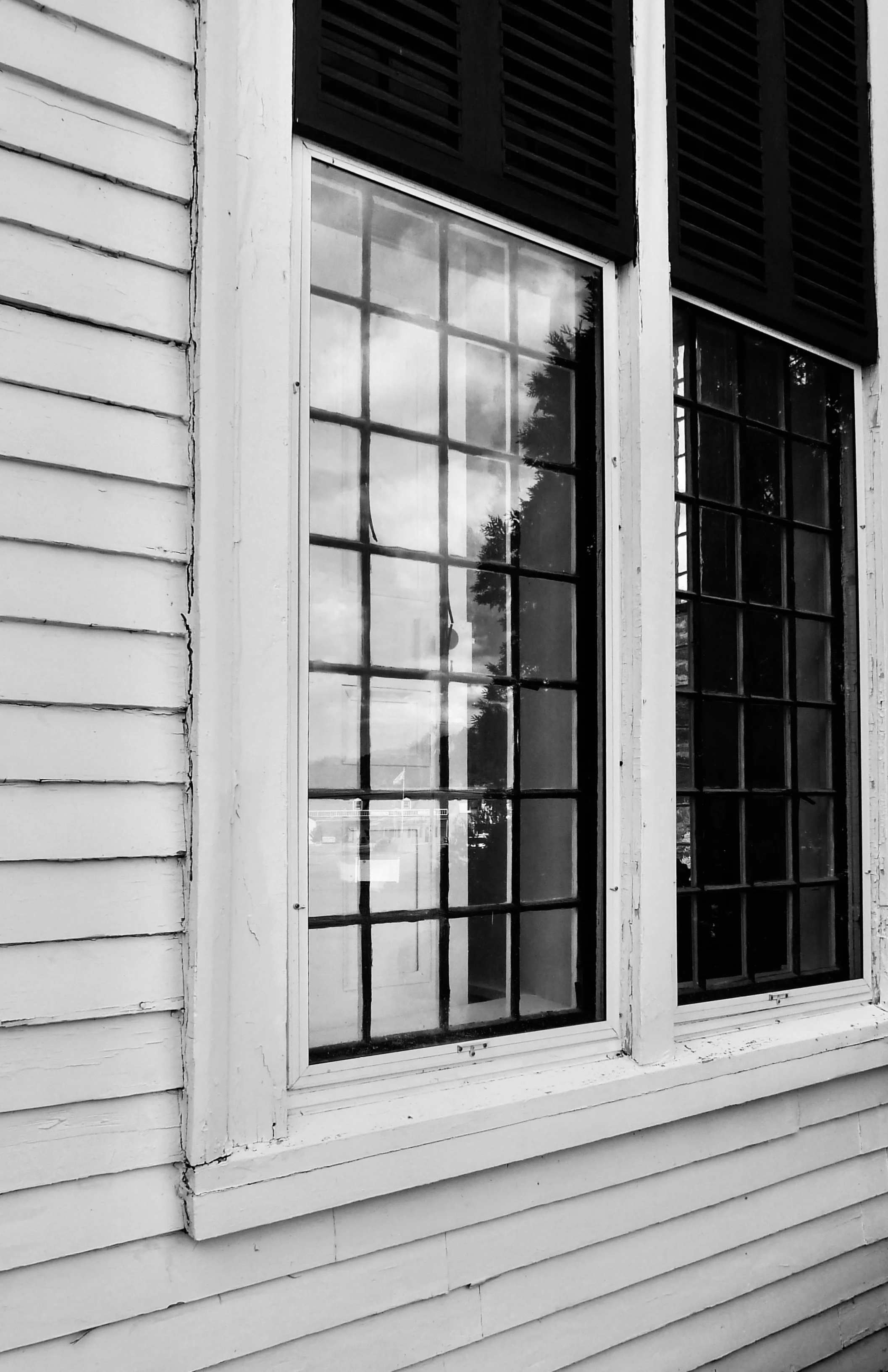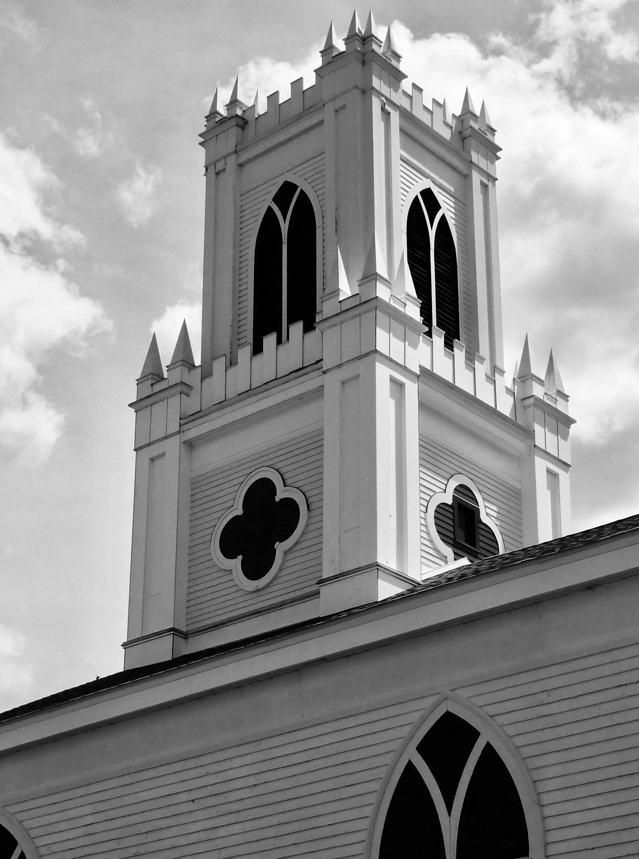 There are no great masonry walls or expanses of stained glass. The meeting house windows have pointed tops, the tower base has louvered openings in the shape of quatrefoils, and the corners of the parapets have spikey caps