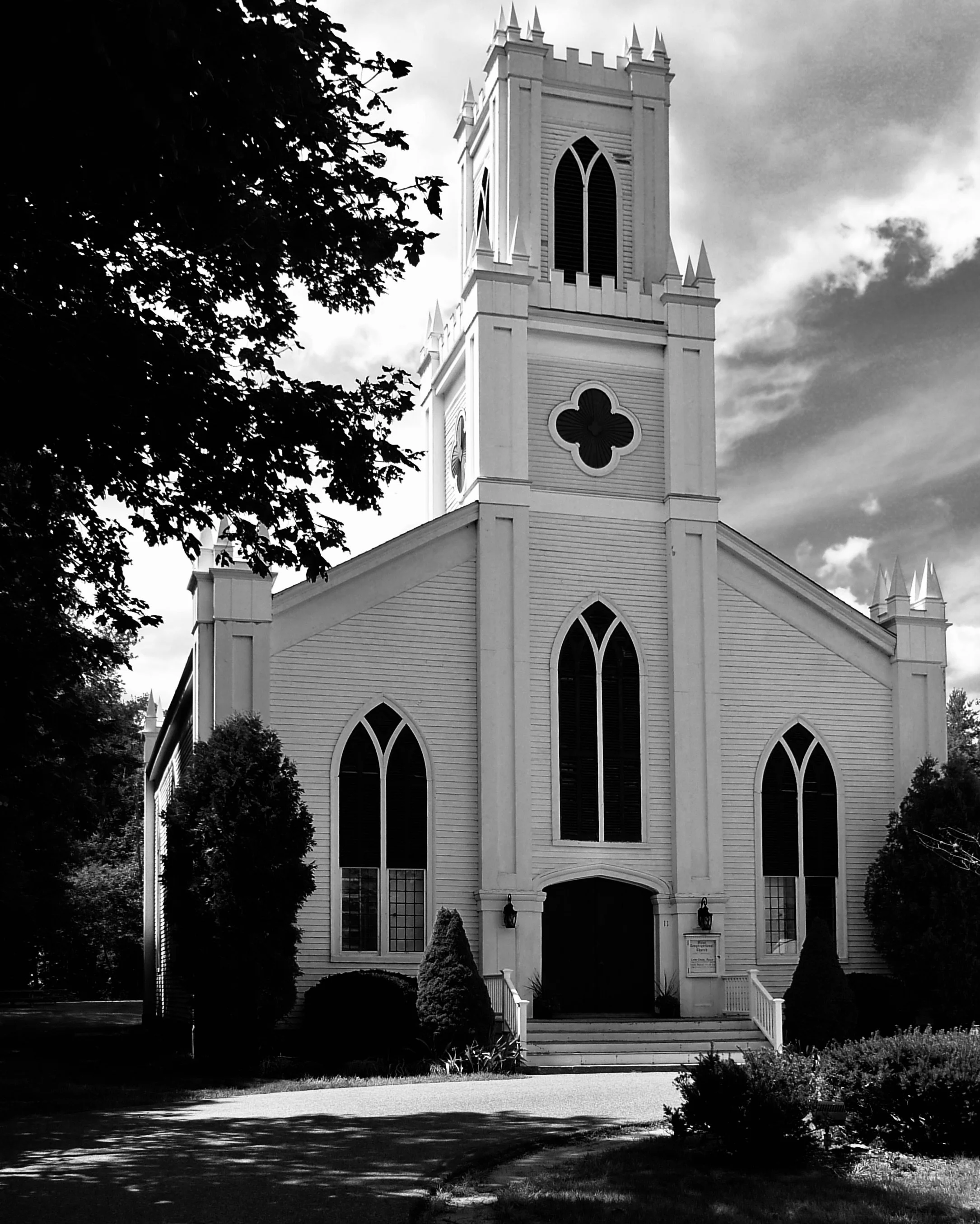 Rochester’s town common boasts a marvelous Carpenter’s Gothic church. The church’s foundation goes back to 1703, but this confection dates to the middle of the 19th Century. The First Congregational Church’s medievalism is a riff on the typical New England Meeting House: a simple preaching box with a battlemented tower instead of a multi-tiered Georgian steeple.