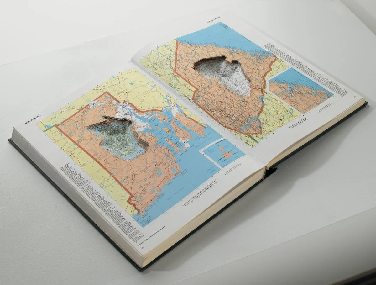 “From Rhode Island to South Carolina (Rand Mc-Nally’s The Great Geographical Atlas)” (1991), by Maya Lin (Maya Lin Studio, courtesy of Pace Gallery, photograph by G.R. Christmas), in the show “Maya Lin: Mappings” through Aug. 7, at the Smith College Museum of Art, Northampton, Mass.