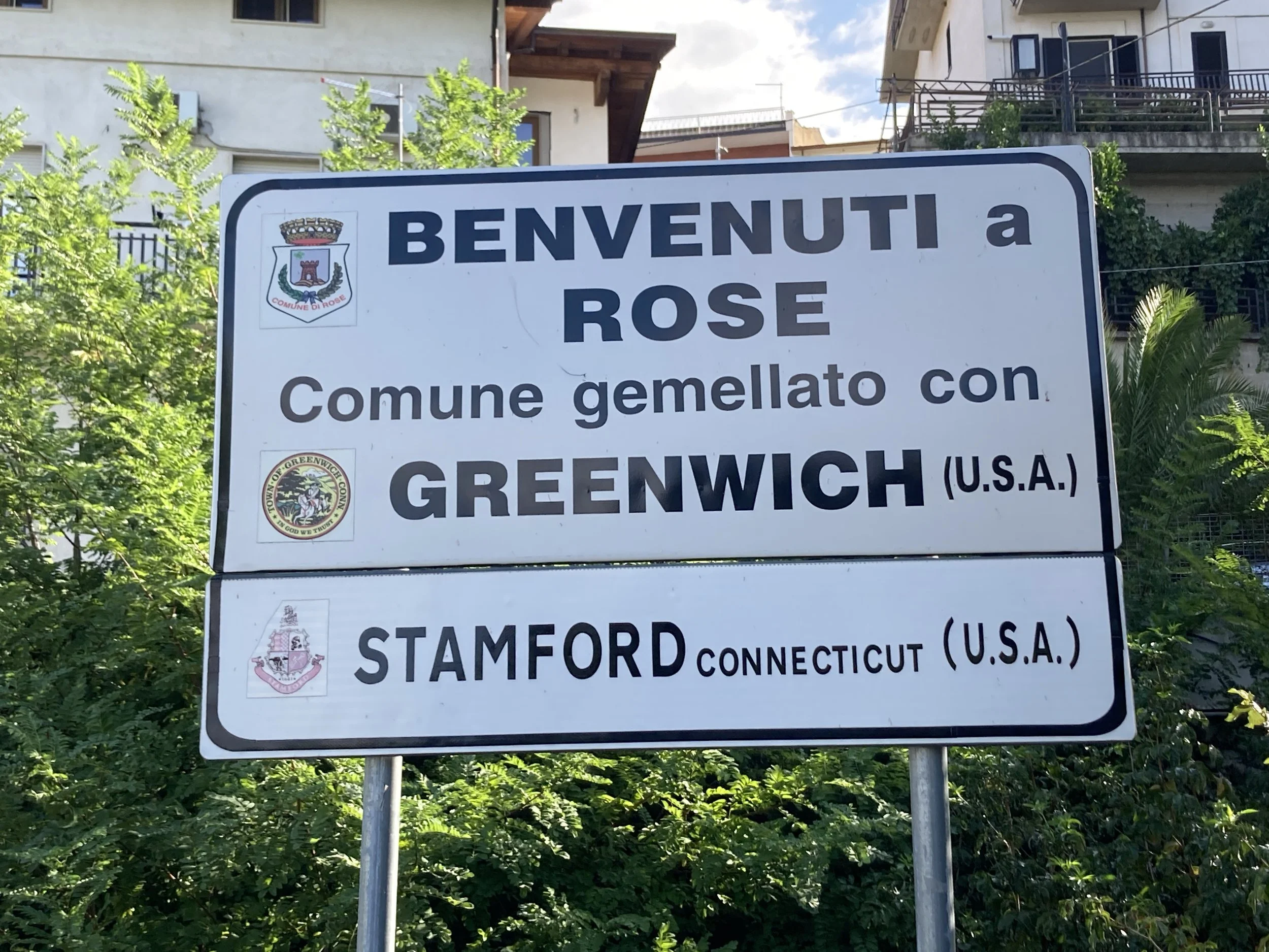 Our friend Bill Perna, who grew up in Greenwich, was very surprised to come across this sign while driving into the town of Rose in Italy’s Calabria region.