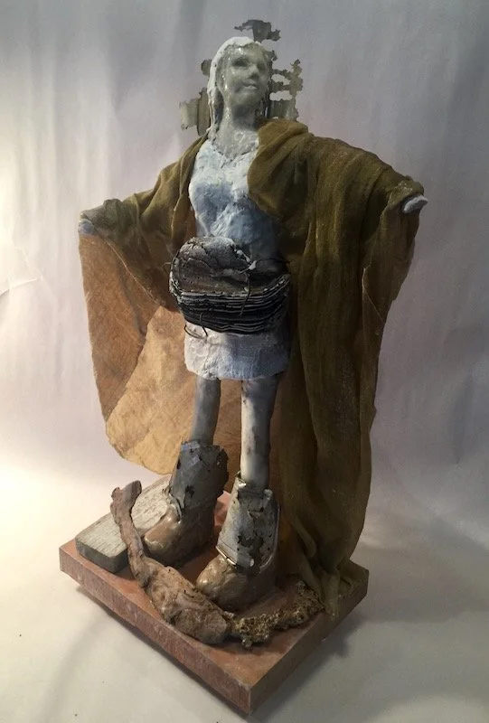“Our Lady of the Recycling Center” (encaustic over fiber clay with found objects), by Otty Merrill, a member of New England Wax (newenglandwax.com) who is based in Tenants Harbor, Maine.