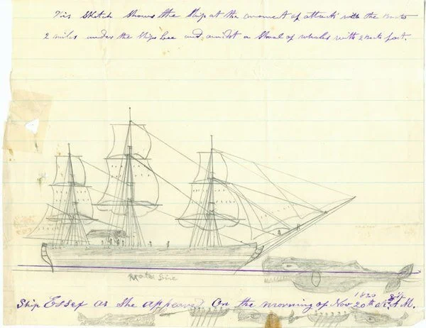 “The Essex was a whaler from Nantucket launched in 1799. In 1820, while in the Pacific Ocean under the command of Capt. George Pollard Jr., she was attacked and sunk by a sperm whale. Thousands of miles from the coast of South America with little food and water, the 20-man crew was forced to try to make for land in the ship's surviving whaleboats.