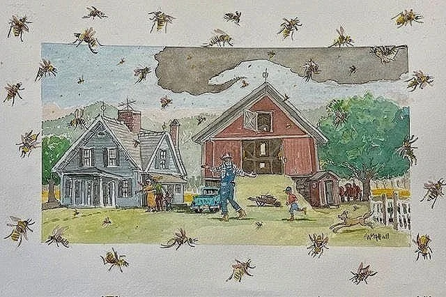 Gramps looked at her perplexed as he turned to see what she meant. Something amazing and frightening was happening in the sky behind him. He had never seen anything like it before, and nor would he ever again. He looked back in awe at a jet-black roiling cloud in the sky over the Connecticut River. “It’s bees!”Then suddenly,“ SWARM!” he yelled as he set down his coffee can.