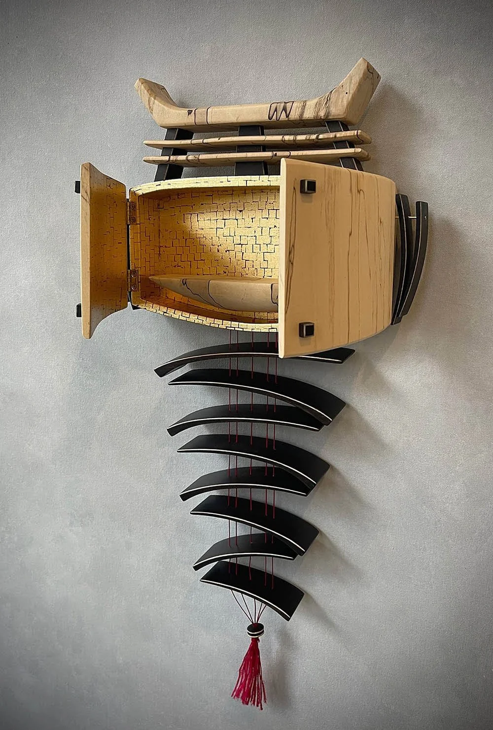 “Inspired by the beauty of impermanence, each piece incorporates bones, natural fibers, and decaying wood grains. The shimmer of gold peeking through the doors offers the suggestion of what lies beyond our world.