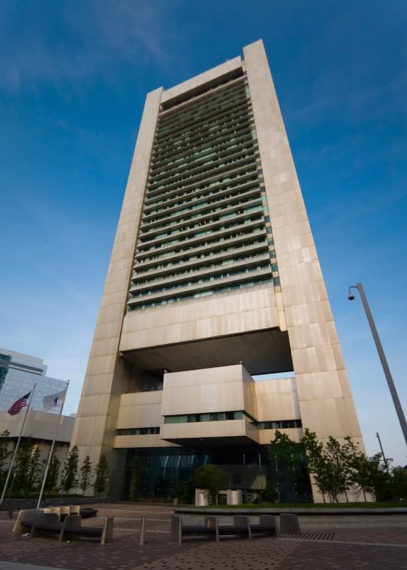 The (Brutalist) Federal Reserve Bank of Boston tower, at the edge of the Boston financial district.