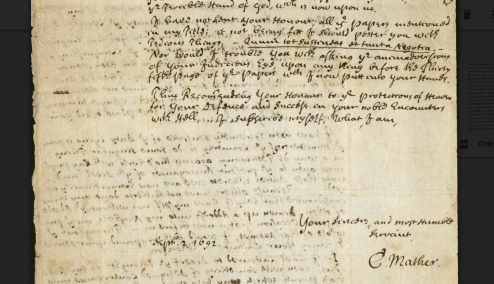 Letter from The Rev. Cotton Mather (1663-1728) to Massachusetts Judge William Stoughton (1631-1701), dated Sept. 2, 1692