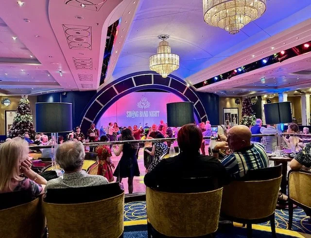 Last night, the QM2 band played swing music and the floor was alive with pairs of agile ancients dancing all the styles, including the Lindy Hop and the Jive. They had all the moves and the clothes, especially the ladies: They wore full, flowing skirts for twirling.