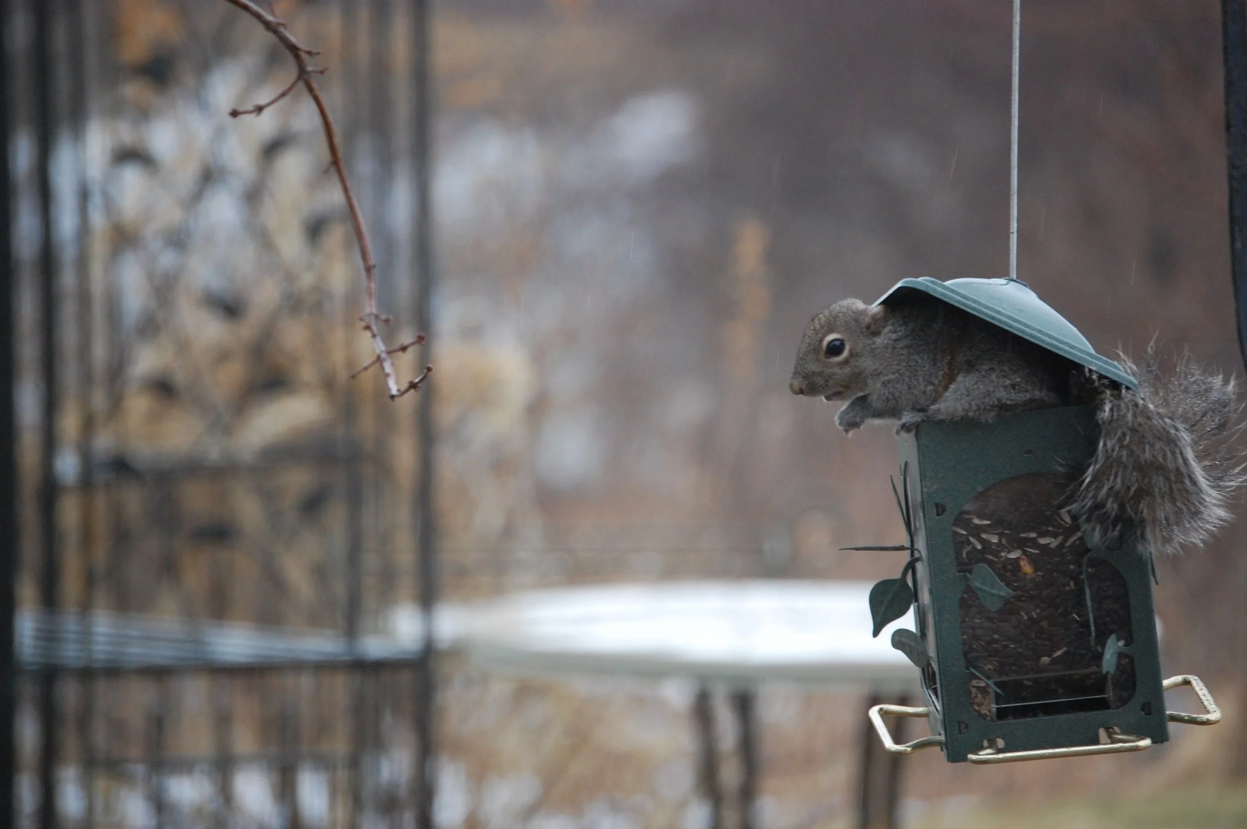 Of course the squirrels grow fat on bird food: They’re good Americans! But if your feeder is at the top of a pole, you can pour a little vegetable oil on it and watch these often obese and ingenious rodents struggle to climb up.