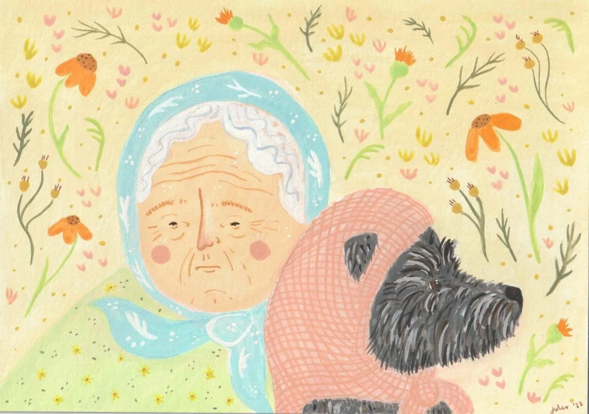 “A Woman and Her Dog” (gouache on paper), by Worcester area artist Julia Mongeon, in the show “The Tenth Annual One: A Members’ Exhibition,’’’ at ArtsWorcester, through Aug. 21.