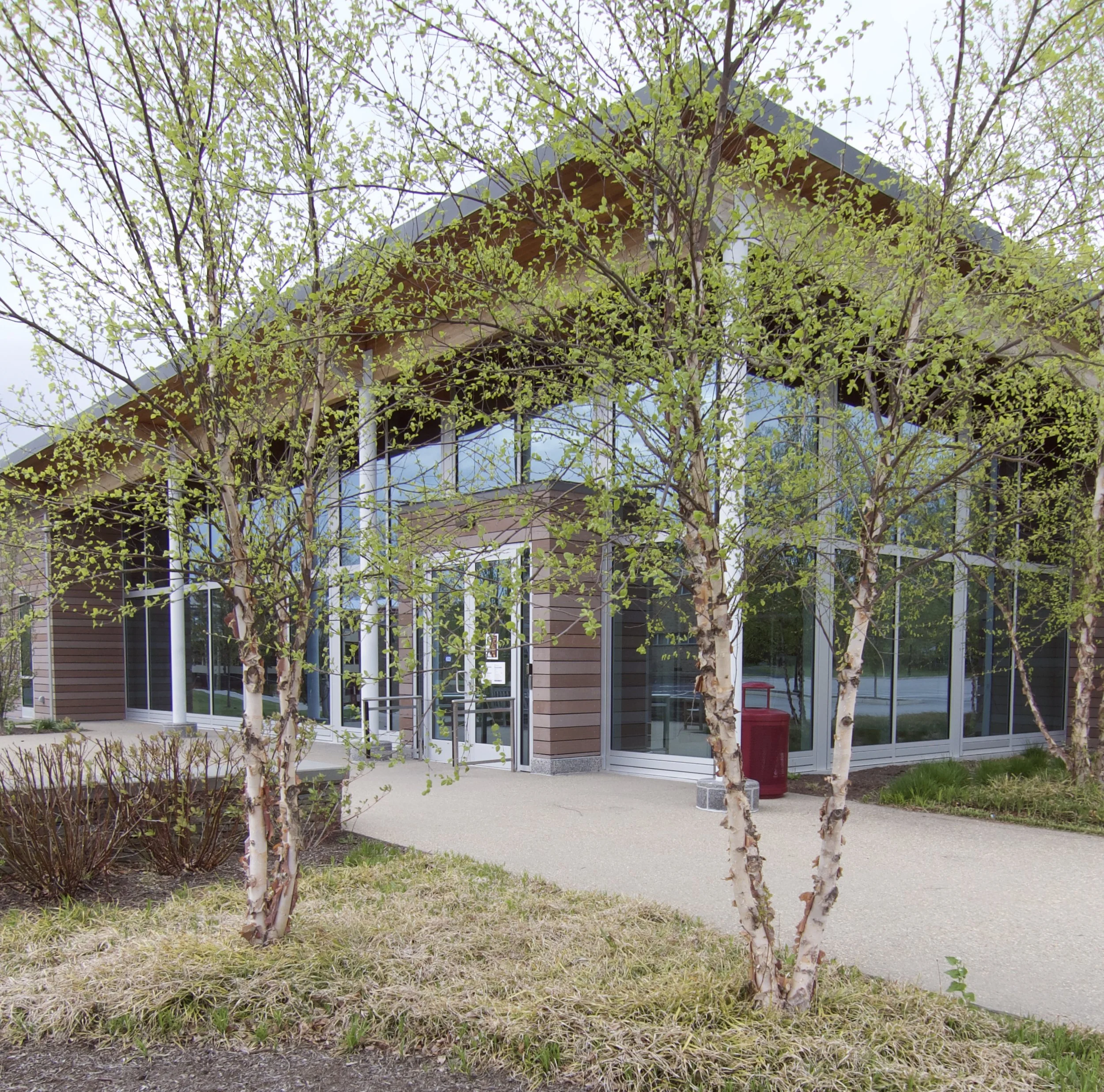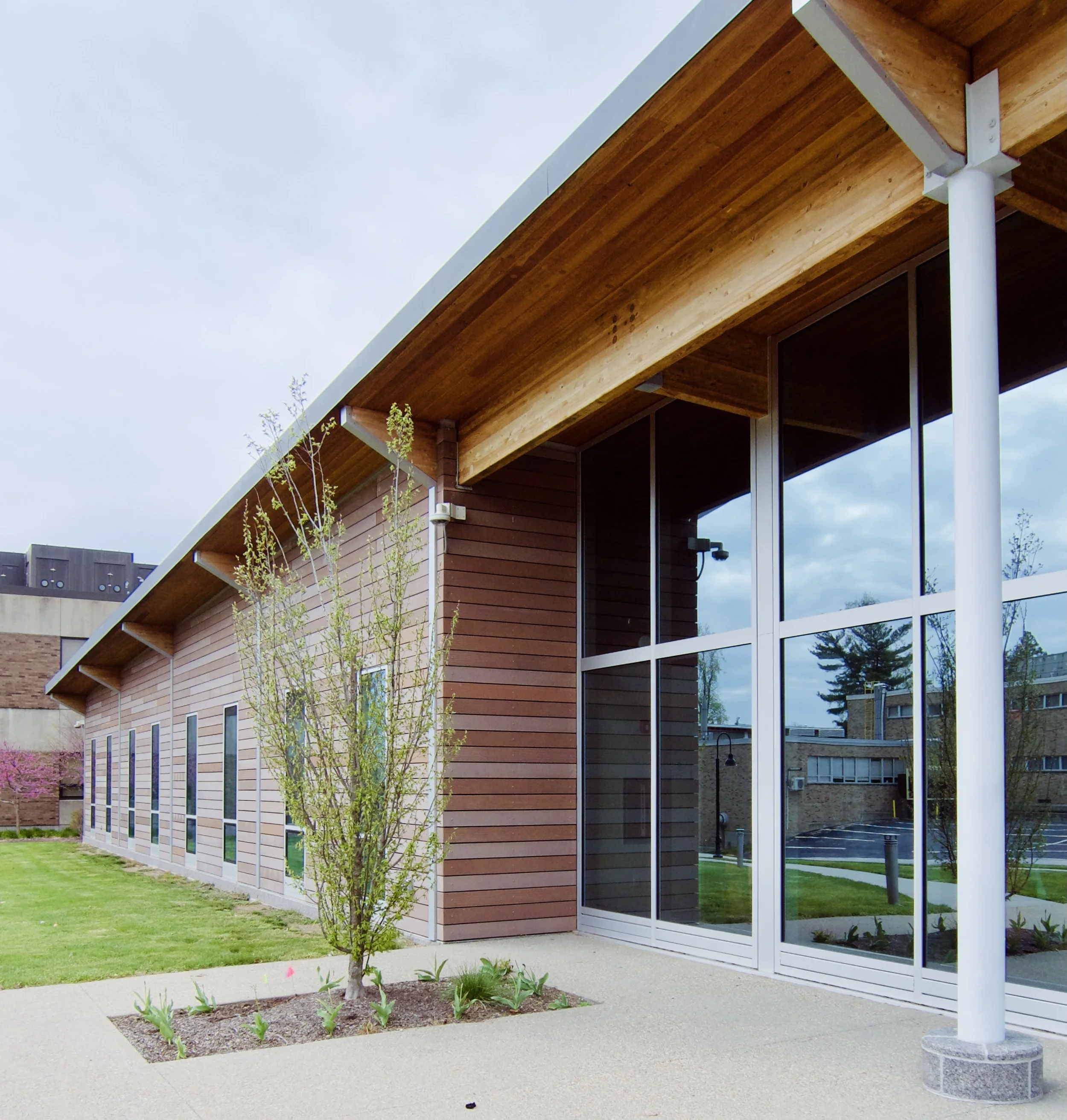 The curtain wall mullions could be a little more sophisticatedly detailed, and the boxy entry vestibule is a little awkward. But the laminated timber implies strength; the entire materials palette, especially the concrete plank covering, complements the wood framing. This is a gentle, sensibly proportioned building that does not try too hard. The most appealing aspect of the school of nursing is perhaps the landscaping, where river birches set amidst natural grasses contribute a pastoral Scandinavian ambience.