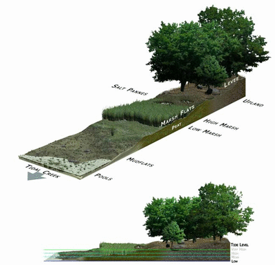 Salt marsh during low tide, mean low tide, high tide and very high tide (spring tide).