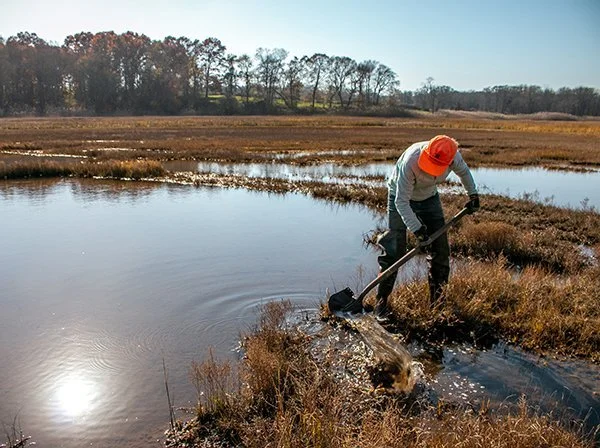 The cordgrass roots are taut, but they cut easy. Just one stomp and the shovel sinks through the muck, water pooling up and over the toes of Ferguson’s black rubber boots.