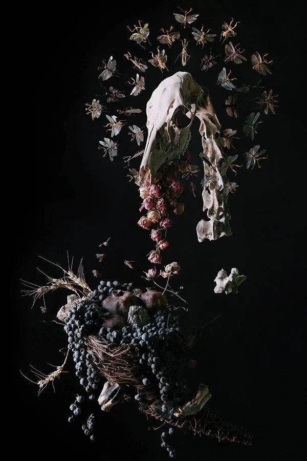 “Sellios is a Boston-based artist whose monumental photographs highlight the beauty of the grotesque. Sellios creates still-life vignettes from organic materials including animal bones, insect specimens and dried flowers which she photographs using a large format 8 X 10 inch camera. Printed at a large scale, Sellios’s photographs capture the vivid details of her materials.’’
